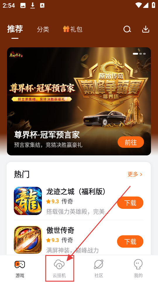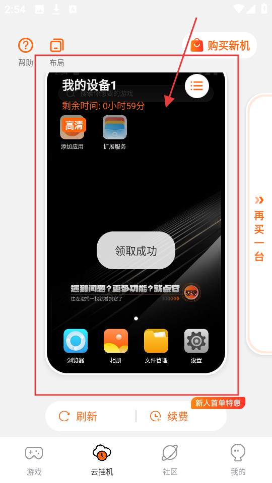 1、点击【云挂机】,进入云挂机界面,可领取云手机服务哦。