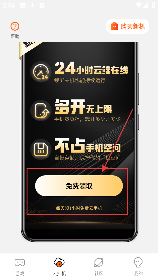2、在云挂机界面点击【免费领取】,就能领取每天1小时的免费云手机啦。