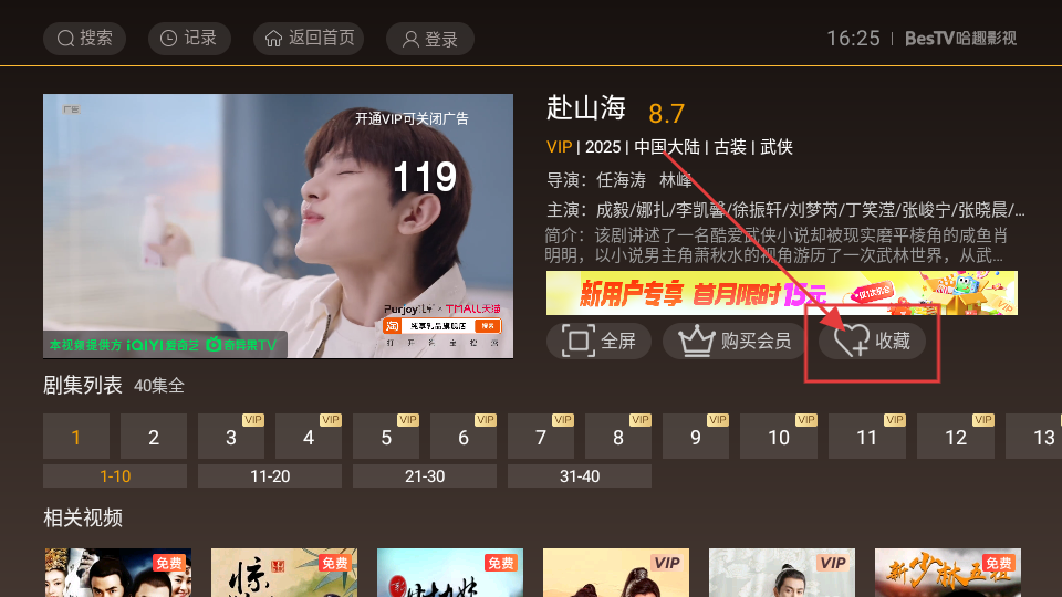 2、进入影视播放页面后,点击【收藏】按钮,就可以把这部影视收藏起来,方便后续查找哦。