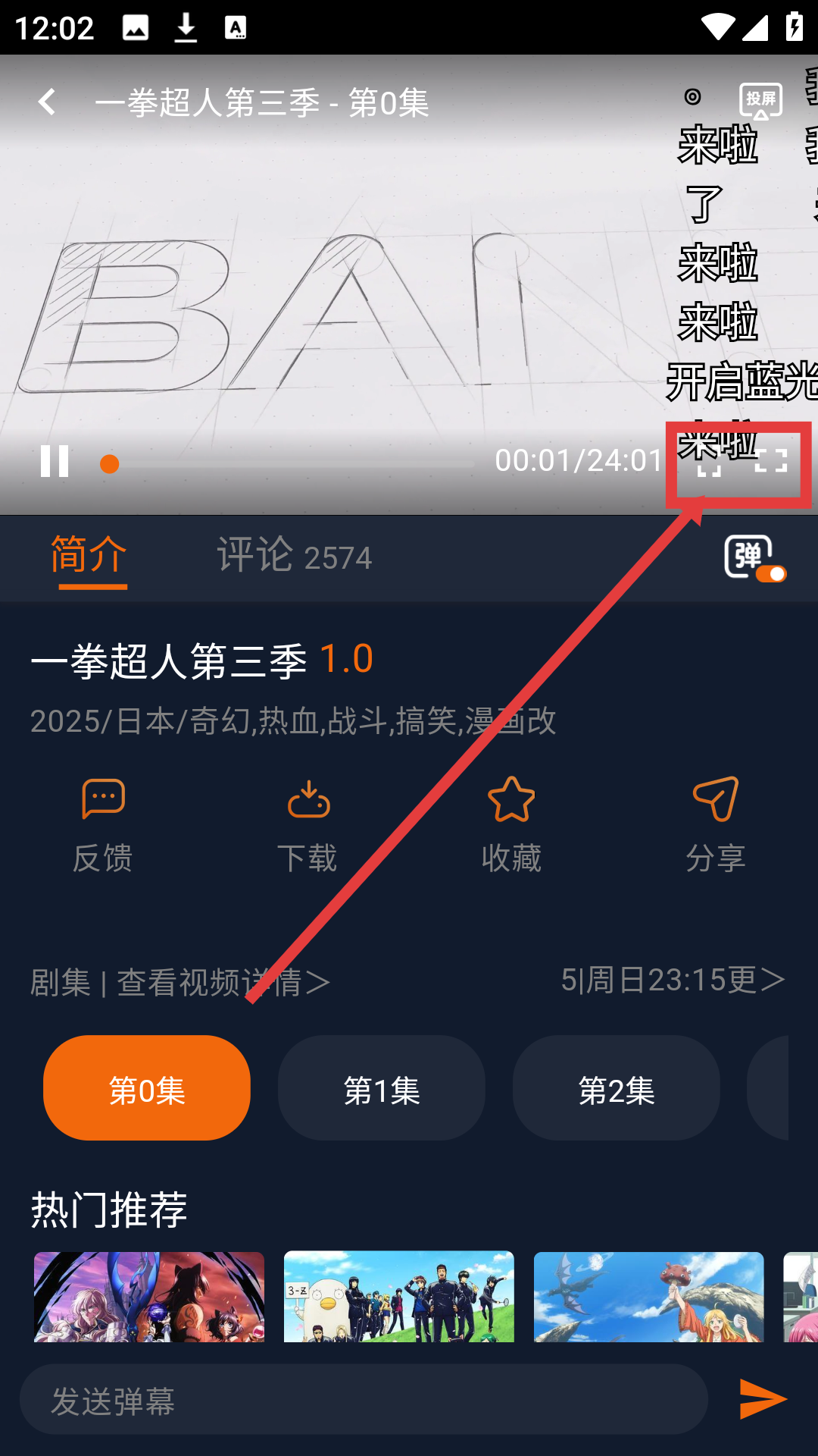 1、在播放页面点击全屏按钮,可切换到全屏模式观看《一拳超人第三季》,视觉体验更沉浸哦。