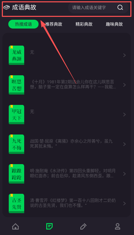 3、写作时遇到词汇不足,可以去“成语典故”区搜索,输入关键词就能查到出处和用法。