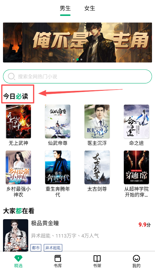 1、软件核心是找书和看书。找书有两个路径:一是首页的“今日必读”推荐,二是通过“全部分类”进行精确筛选。