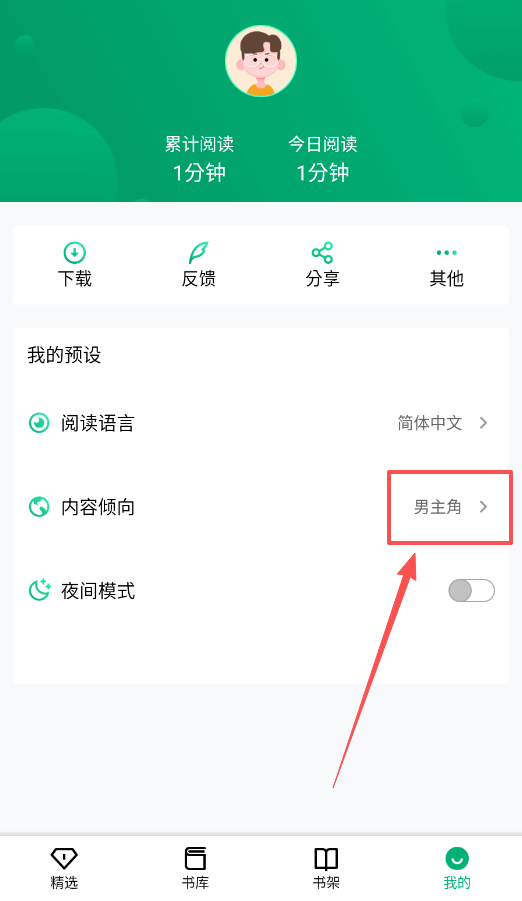 3、个性化设置都在“我的”页面,关键是把“内容倾向”设为“男主角”,这样主页和推荐会更对你胃口。