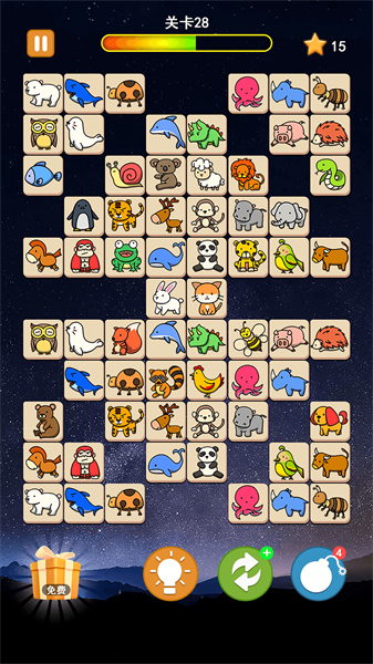 1、游戏里去匹配两个相同的动物,以经典的 "点连线 "方式消除它们。