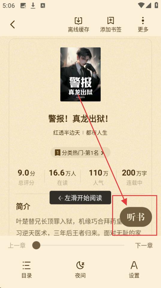 1、若想找小说听书,在书城热度榜选一本,比如【警报!真龙出狱!】,点击进入详情页。