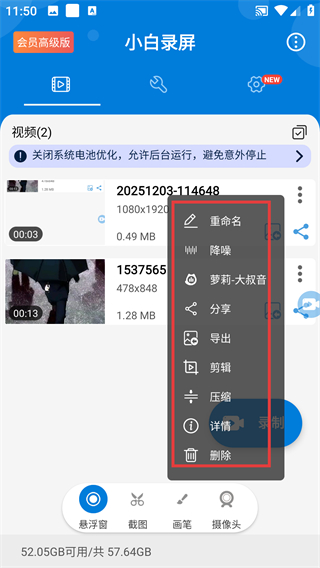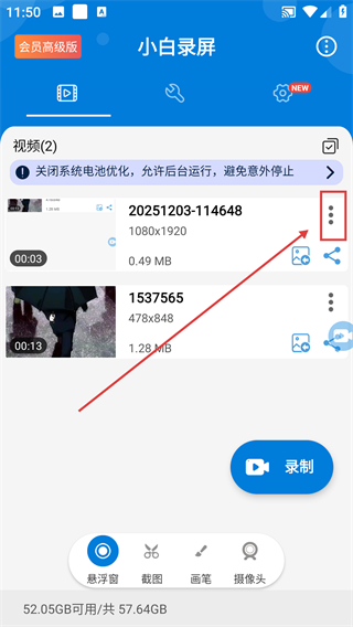 1、在小白录屏首页,点目标视频右侧的三点按钮,能展开操作菜单,后续可对视频进行编辑等操作啦。
