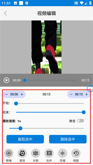 4、进入视频编辑页后,可调开始结束节点、播放速度,还能点【截取选中】来剪辑视频片段哦。