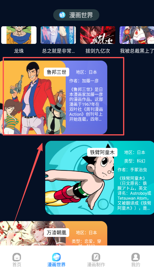 2、第二步是拓展发现,进入漫画世界浏览龙珠、鲁邦三世等推荐作品,通过查看地区、作者等信息来高效判断是否符合口味。