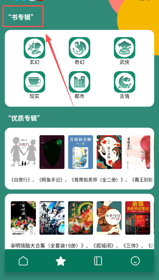 2、接着去“书专辑”区域看看,那里按玄幻、都市等类型分好了类,还能发现白夜行这类优质书单,点击标签就能展开对应专题。