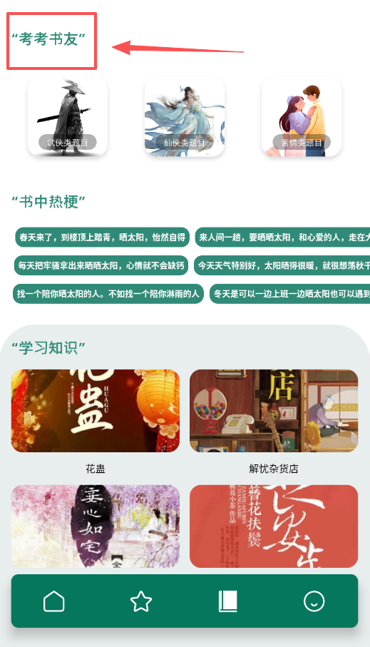 3、要是想互动,可以逛逛“考考书友”和“书中热梗”,那里有武侠仙侠的趣味话题,还有书友们分享的晒太阳小段子。
