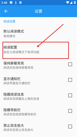 3、在设置界面点击【阅读配置】,进入阅读配置界面,能自定义阅读模式的功能哦。