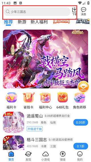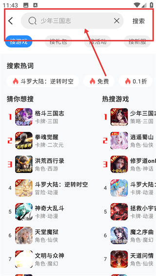 1、在首页点击顶部搜索框,输入想要找的游戏名称,就能进入搜索页面查找对应的游戏啦。