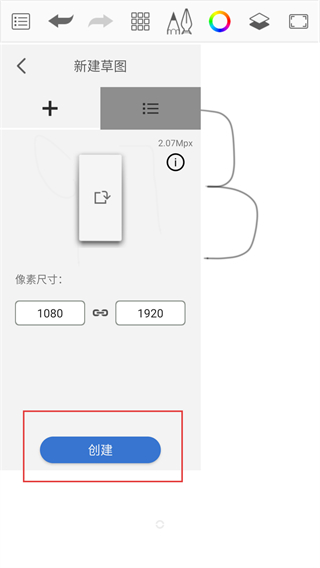 3、在新建草图页确认像素尺寸后,点击底部的【创建】按钮,就能生成新的绘图画布开始创作啦。