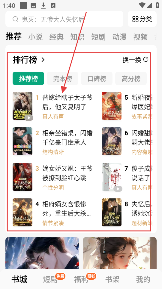 1、我们打开软件,在排行榜的推荐榜里,选择喜欢的小说,点击就能进入该有声书的播放页面啦。