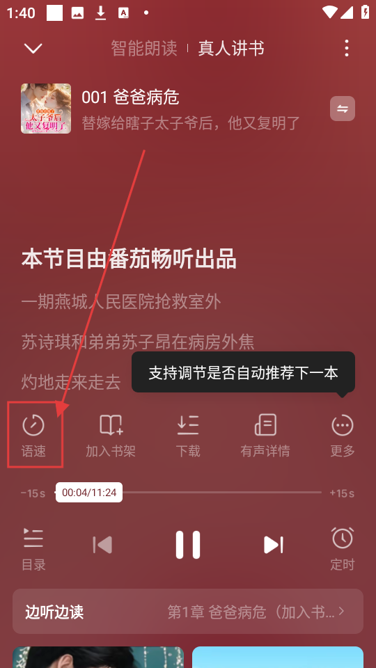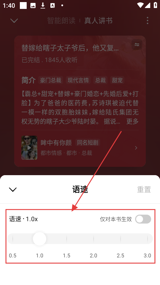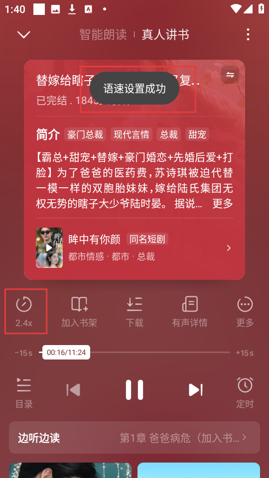 4、语速调整生效后,回到有声书播放页面,就能以调整后的语速收听小说啦。