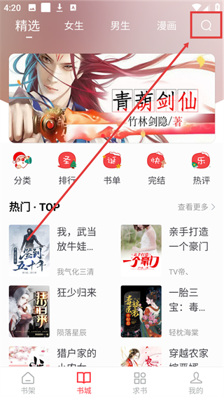 1、在书城界面点击右上角的【搜索】按钮,就能打开搜索页面,准备查找想看的书籍啦。