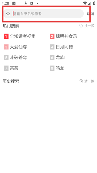 2、进入搜索页面后,在搜索框输入书名或作者,也能直接选热门搜索里的书籍,快速找到目标哦。