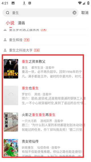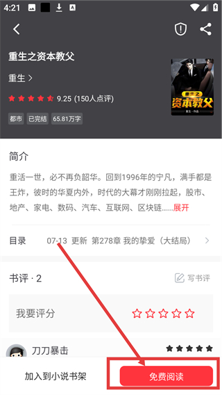 3、搜索结果出来后,点击想看的书籍比如【重生之资本教父】,就能进入这本书的详情页面啦。