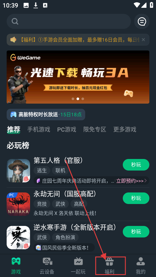 1、游戏页面有推荐、必玩榜等,若想领福利,就点击底部【福利】,进入福利中心。