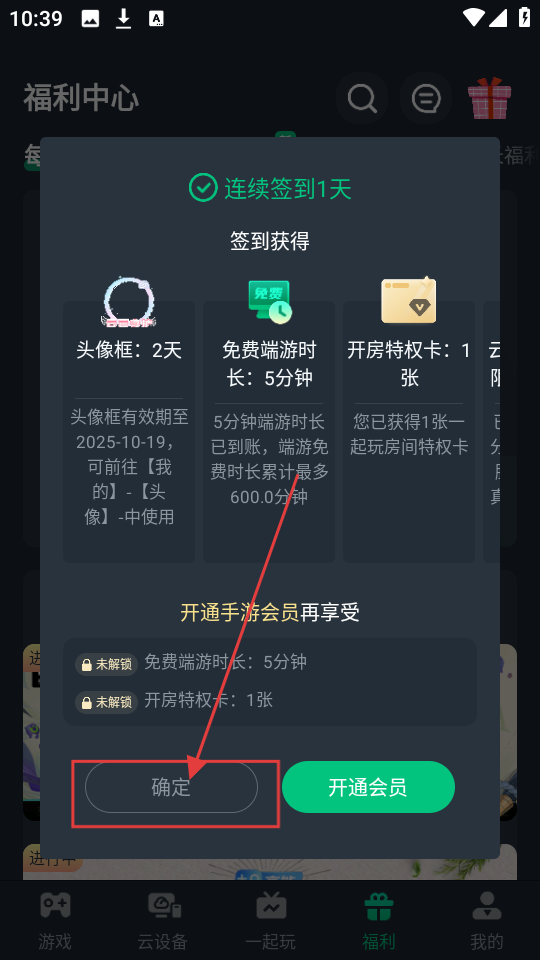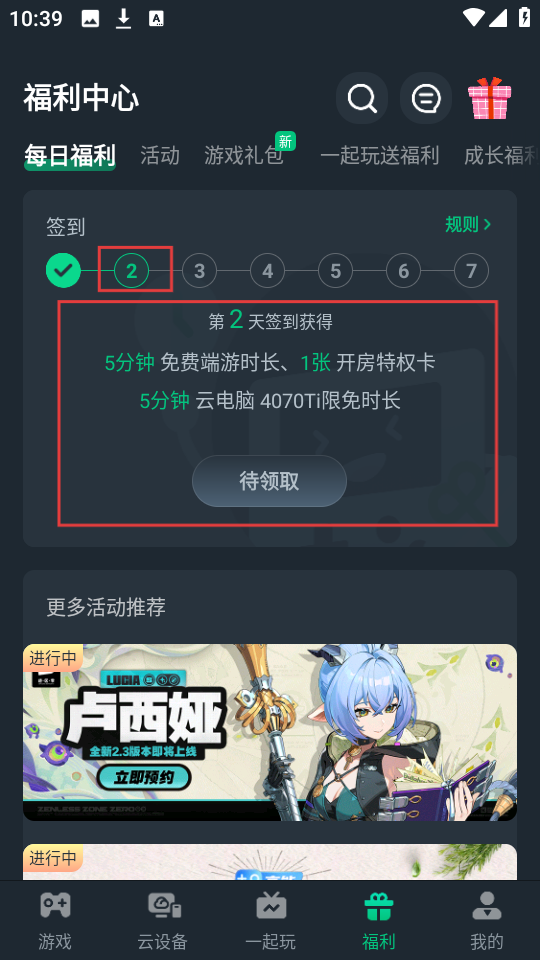 4、确认领取后,福利中心签到进度更新,第二天还能领取【5分钟-免费端游时长】等奖励。