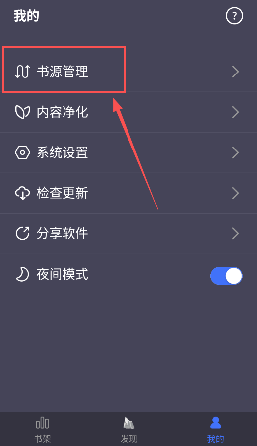 3、在“我的”页面中,务必优先设置好“书源管理”,确保阅读流畅,你还可以在这里开启夜间模式、调整净化规则。