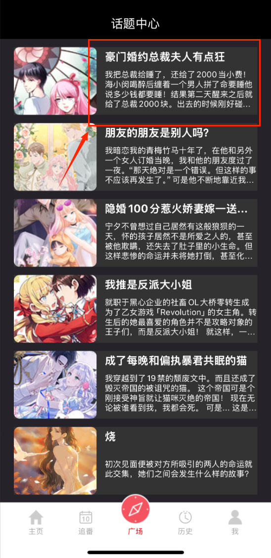 1、在话题中心可以看到各种漫画讨论帖,比如"豪门婚约总裁夫人有点狂"等热门话题,每个话题都有精彩摘要吸引阅读。