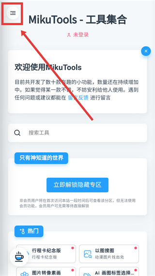 1、在MikuTools首页点击左上角的菜单按钮,就能展开侧边栏,找到各类功能入口啦。