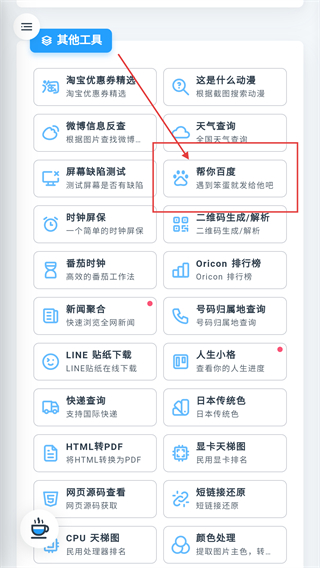 1、在其他工具列表里点击【帮你百度】选项,就能进入该工具页面,准备生成搜索链接啦。