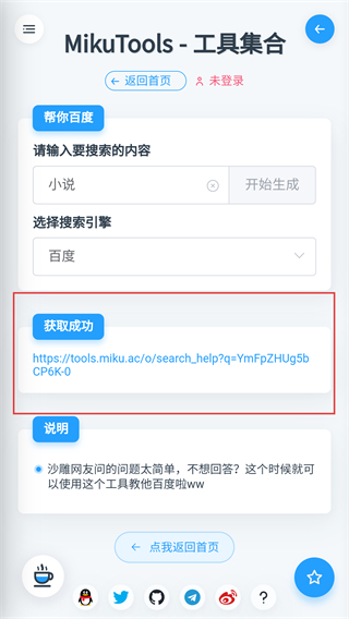4、填好内容选好引擎后点击【开始生成】,页面会显示【获取成功】的链接,直接分享即可哦。