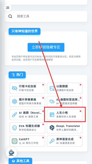 1、在工具列表页点击【人生小格】选项,就能进入该工具的页面,准备查看人生进度相关内容啦。