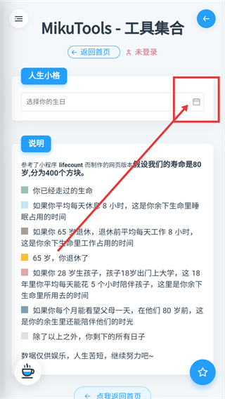 2、进入人生小格页面后,点击生日选择框旁的日历按钮,就能打开日期选择器,挑选自己的生日啦。