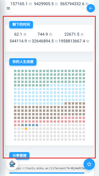 4、选完生日后,页面会展示【剩下的时间】和【人生进度】方块图,还能点击分享链接把内容分享出去哦。
