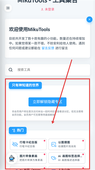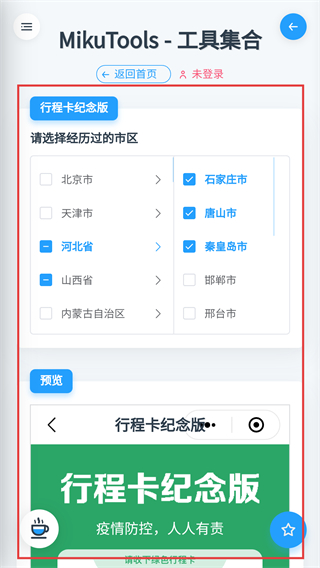 1、在MikuTools首页点击热门区域的【行程卡纪念版】工具,就能进入对应功能页面,准备制作纪念版行程卡啦。