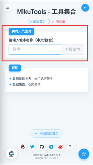 4、进入实时天气查询页后,在输入框填写城市名称(比如昆明),点击【开始查询】就能获取对应城市的天气啦。