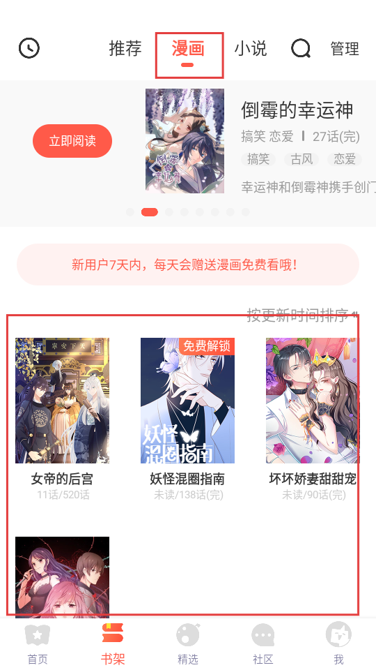 4、之后去书架的【漫画】分类里,就能看到收藏的【女帝的后宫】等漫画,随时可以继续阅读哦。