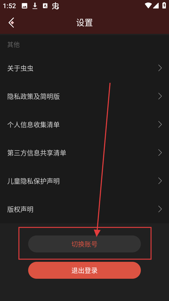 2、进入设置页面后,找到【切换账号】按钮,点击它就能进入切换账号页面,准备添加新账号啦。