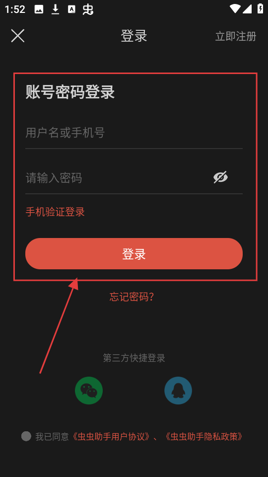 4、进入登录页面后,输入新账号的用户名或手机号、密码,然后点击【登录】按钮,就能完成新账号登录啦。