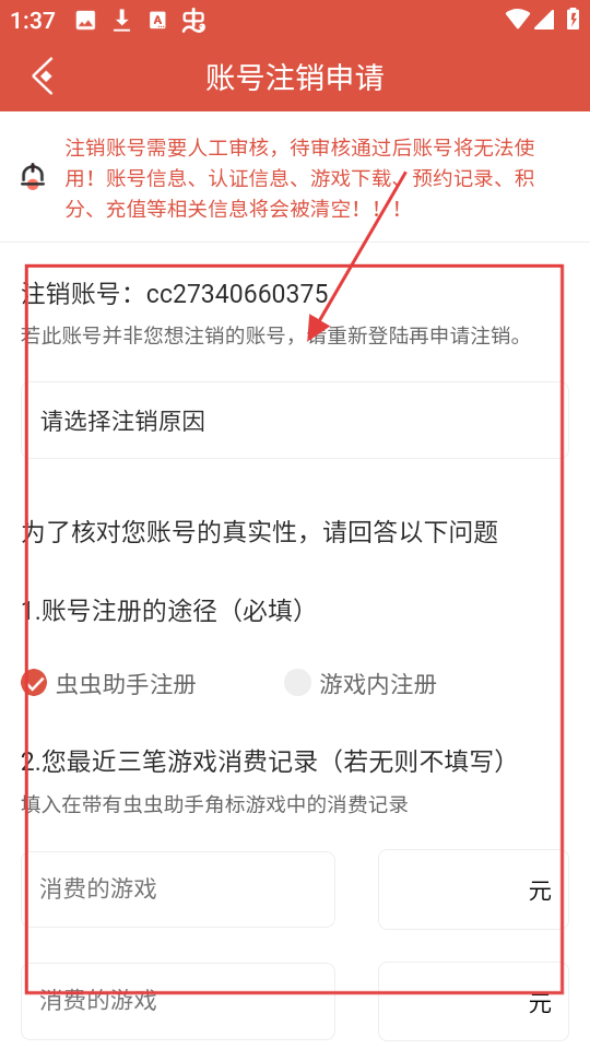 3、进入账号注销申请页面,按要求填写注销原因、账号注册途径等信息,认真完成每一项填写哦。