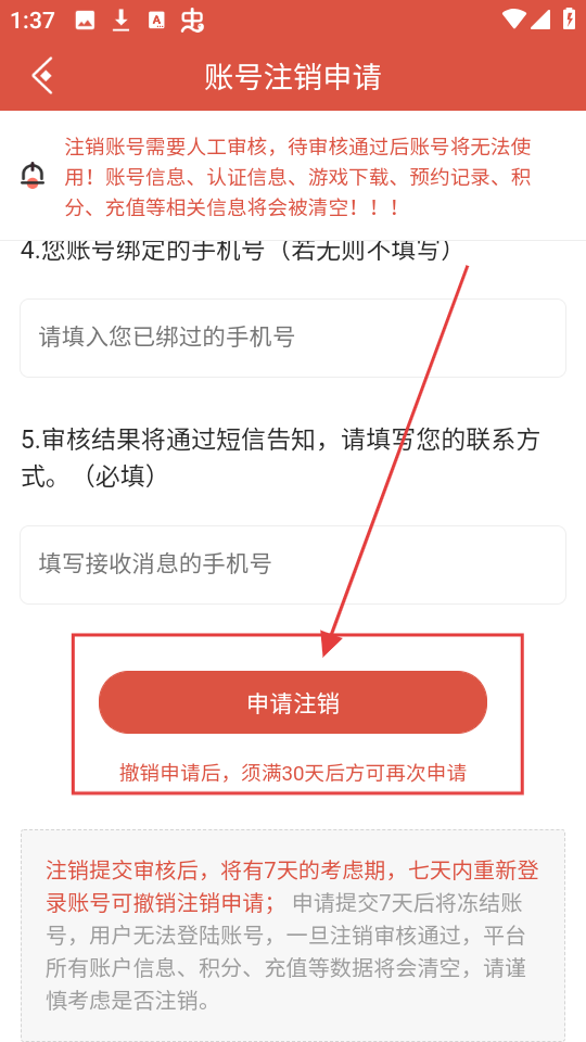 4、填写好所有信息后,点击【申请注销】按钮,就能提交账号注销申请,等待审核结果啦。