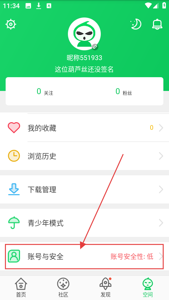 2、进入个人空间页面后,找到【账号与安全】选项,点击它可进入账号安全设置界面啦。