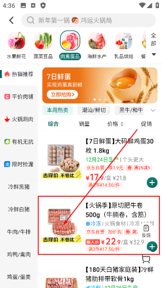 2、进入肉禽蛋奶分类页面后,在商品列表中选定【火锅季原切肥牛卷】,点击进入该商品的详情页面。