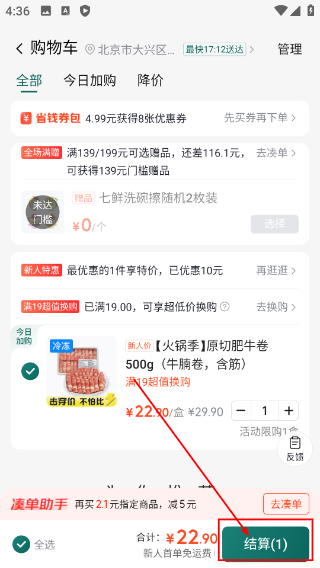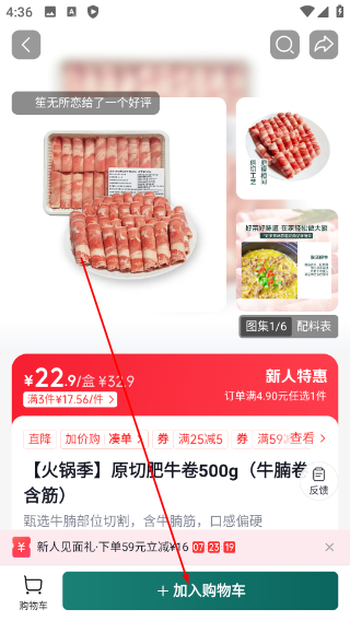 3、在商品详情页面查看信息后,点击【加入购物车】按钮,将该肥牛卷商品添加至购物车中。