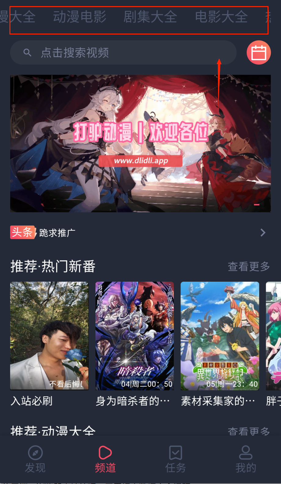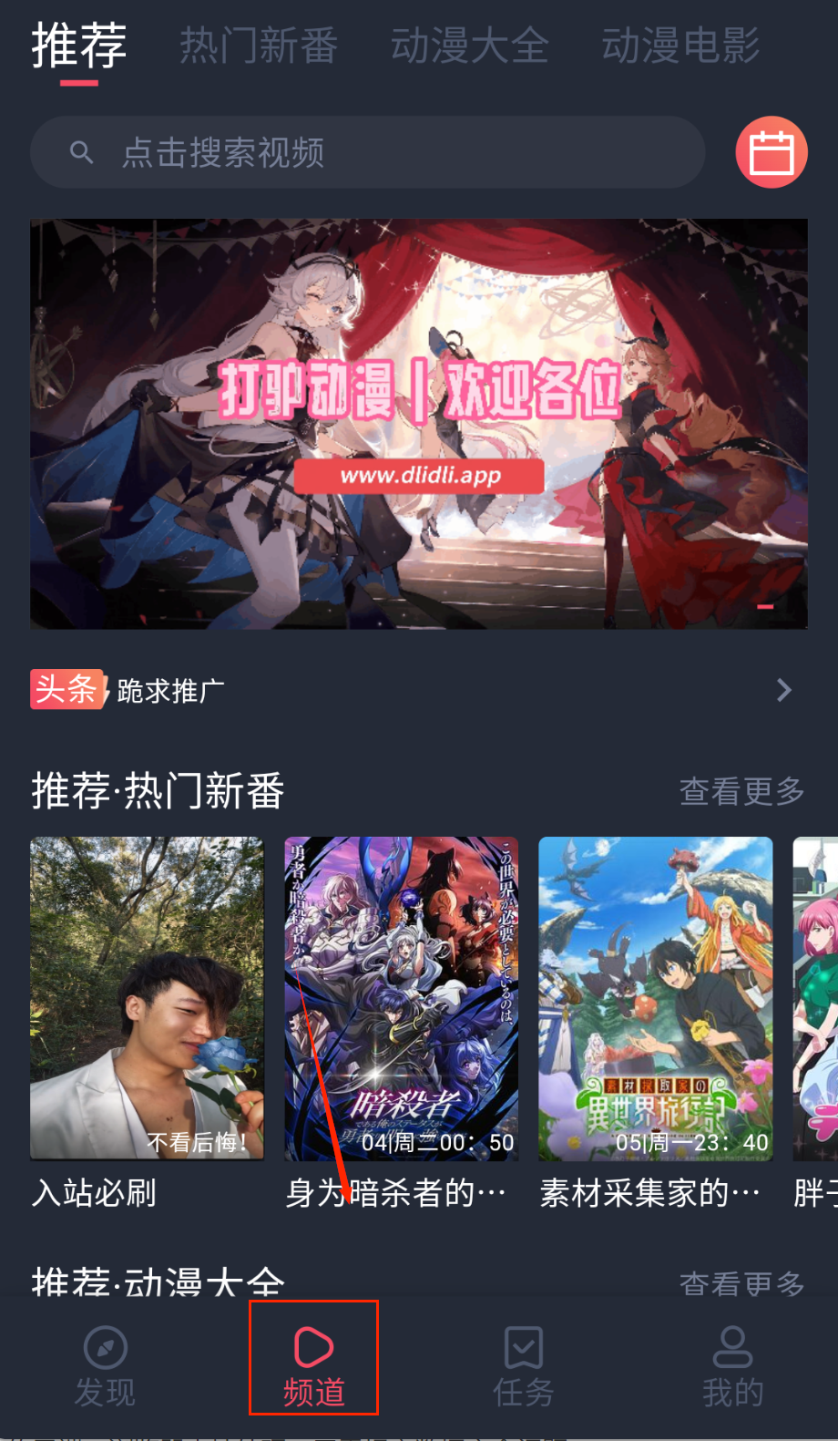 1、打开软件后首先关注首页的推荐内容区域,这里会展示热门新番和精选动漫,通过左右滑动可以浏览不同作品的海报和简介。