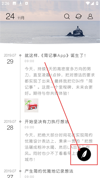 1、在简记事主页面,点右下角的羽毛按钮,可进入新建笔记页面,开始记录内容啦。