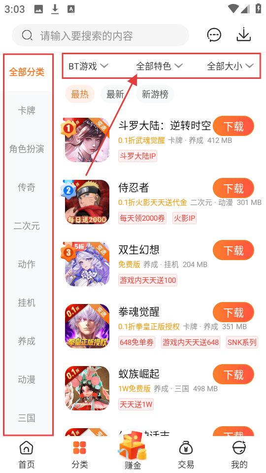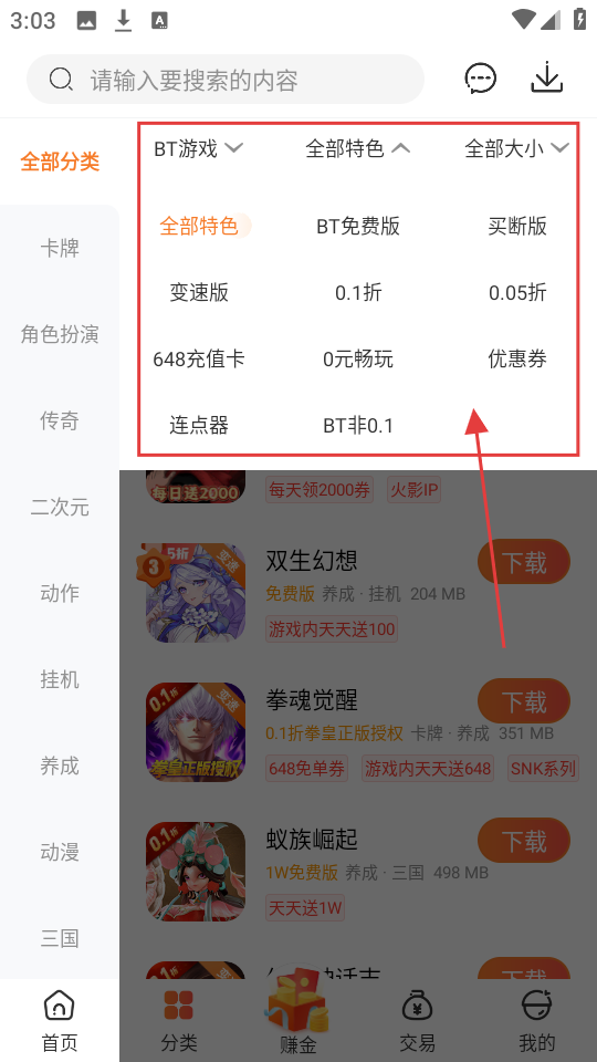 2、分类页可按游戏类型、特色、大小筛选,超灵活呢。