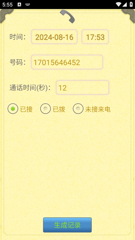 2、多样化的记录选项:支持生成任意时间的通话记录,并可选择已接听或未接听状态,增加真实感。