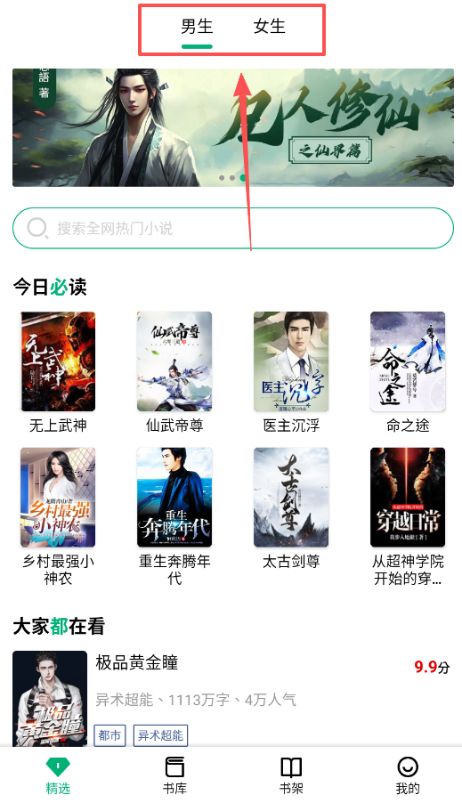 1、初次使用,建议先从首页的“男生”或“女生”入口进入,这是软件的主要分类方式。