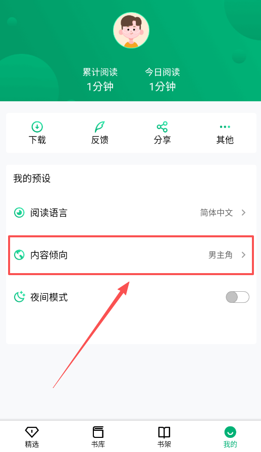 3、在“我的”页面,除了看阅读数据,重点可以设置“内容倾向”为男主角,这样系统推荐会更精准。