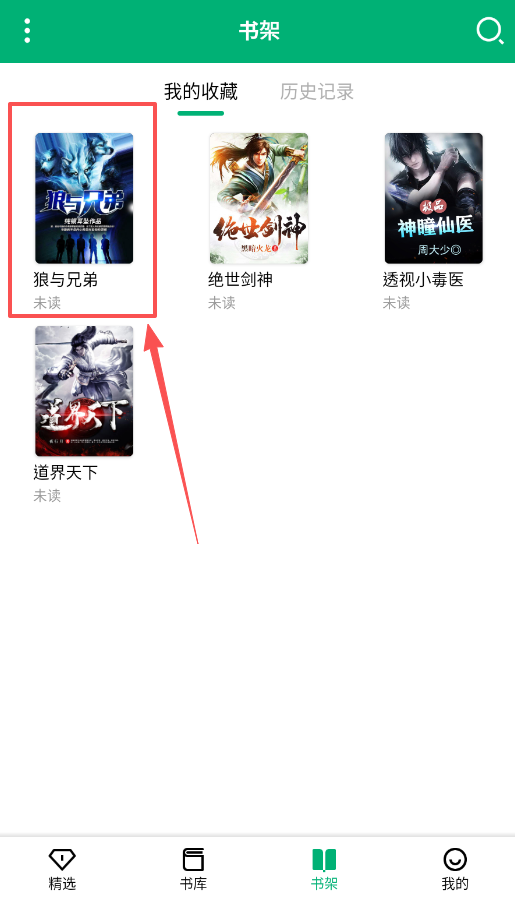 4、追更的小说会自动加入“书架”,像“狼与兄弟”这样显示“未读”标记。