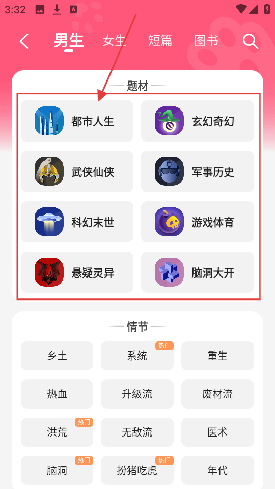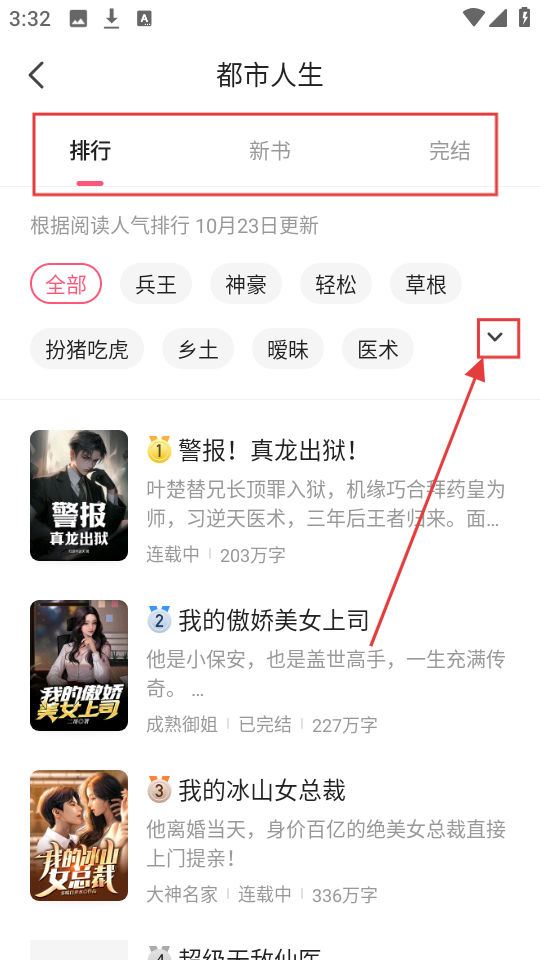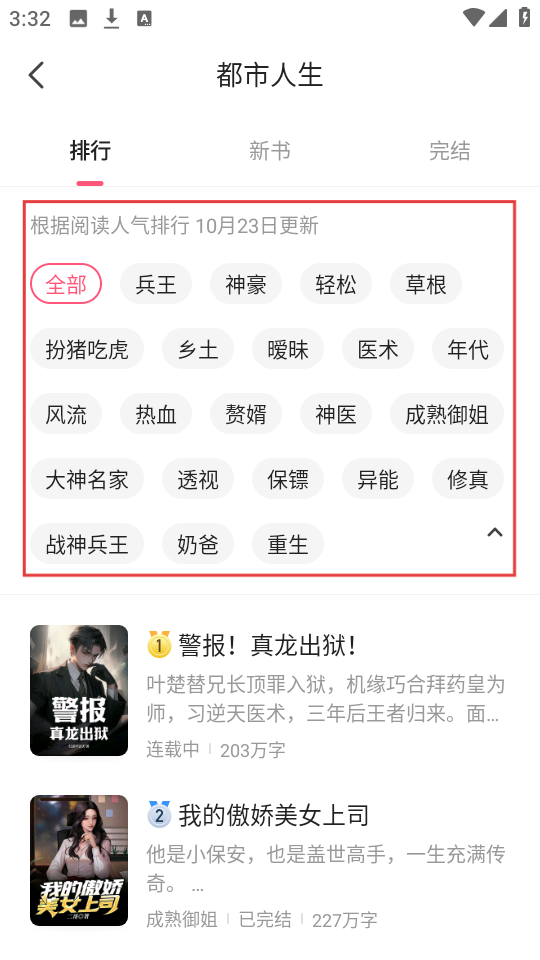 2、进入分类页面后,选择【都市人生】等题材,就能看到对应类型的小说啦。